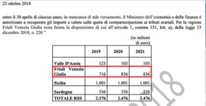 “Il cosiddetto Governo amico chiede al Friuli Venezia Giulia quasi 2,4 miliardi al Friuli Venezia Giulia in tre anni. A venti giorni dalla presentazione della finanziaria regionale non sappiamo ancora su quali risorse potrà fare affidamento Fedriga per costruire il bilancio, se ci saranno ulteriori riduzioni di entrate in conseguenza dell’introduzione della flat tax. Intanto vale ancora lo sconto di 120 milioni previsto dal vituperato patto Serracchiani-Padoan”. Queste alcune osservazioni a caldo del segretario regionale del Pd Salvatore Spitaleri alla prima bozza del disegno di legge di bilancio per il 2019 presentata dal Governo martedì 23 ottobre. In base a quanto si legge nella tabella allegata all’articolo che parla dei “Rapporti finanziari con le autonomie locali”, la Regione Autonoma Friuli Venezia Giulia sarebbe tenuta a versare, “al fine di assicurare il necessario concorso al raggiungimento degli obiettivi di finanza pubblica”, 716 milioni nel 2019, 836 nel 2020 e altri 836 nel 2021.