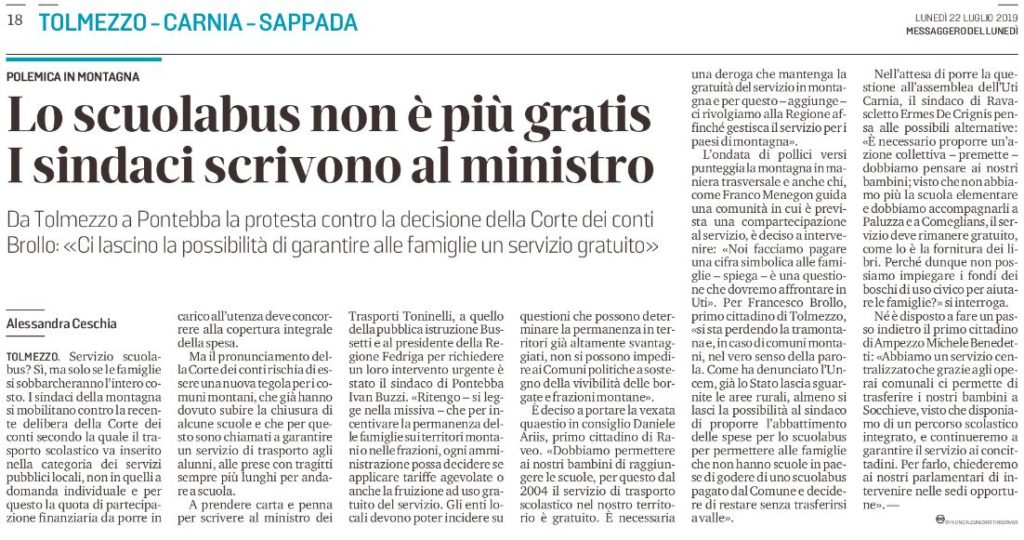 Riferendosi a una recente delibera della Corte dei Conti che imporrebbe a totale carico delle famiglie le spese per il trasporto scolastico, contro cui si sono mobilitati i sindaci della montagna friulana, Serracchiani auspica che “si voglia dare un segno concreto per fermare lo spopolamento delle ‘terre alte’, aiutando gli amministratori locali a fare il loro prezioso lavoro”.