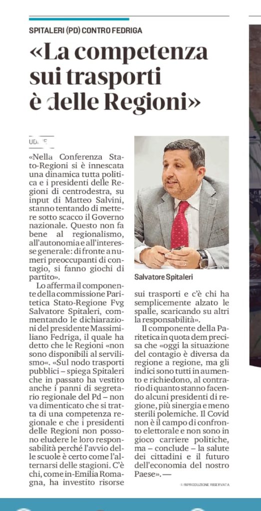 “Nella Conferenza Stato-Regioni si è innescata una dinamica tutta politica e i presidenti delle Regioni di centrodestra, su input di Salvini, stanno tentando di mettere sotto scacco il Governo nazionale. Questo non fa bene al regionalismo, all’autonomia e all’interesse generale: di fronte a numeri preoccupanti di contagio, si fanno giochi di partito”. Lo afferma il componente della commissione Paritetica Stato-Regione Fvg Salvatore Spitaleri, commentando le dichiarazioni del presidente Fvg Massimiliano Fedriga, il quale ha detto che le Regioni “non sono disponibili al servilismo”.