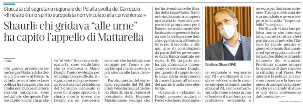 “Un grande Presidente come Mattarella ha detto ciò che serve al Paese; ai cittadini e a un’intera classe politica ha spiegato che ora l’Italia non può permettersi elezioni anticipate. Sono soddisfatto che questo l’abbia capito anche chi gridava ‘al voto’ fino a una settimana fa, sono soddisfatto che si riconosca a Mario Draghi l’autorevolezza per un compito così difficile. Disquisizioni sulla provenienza socialista di Draghi si sono fin troppo sprecate, è chiaro e certo invece che Draghi sia un europeista convinto che ha lottato con coraggio per l’euro e per un’Europa meno austera e più attenta alle fasce deboli”. Lo afferma il segretario regionale Pd Fvg Cristiano Shaurli, replicando al presidente della Regione Massimiliano Fedriga che oggi ha rivendicato che il leader della Lega Matteo Salvini è “indirizzato a compiere una scelta in base alle proposte e al programma per il Paese”.