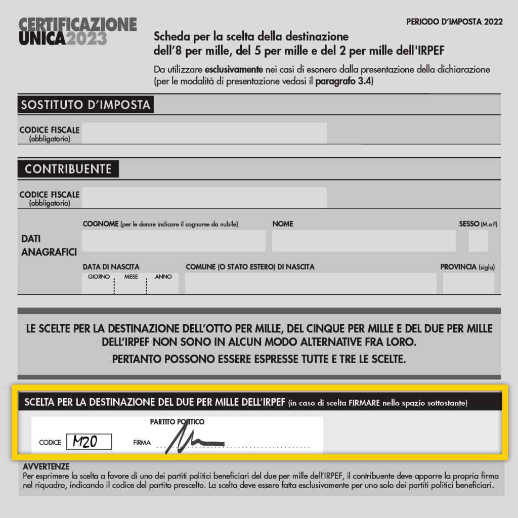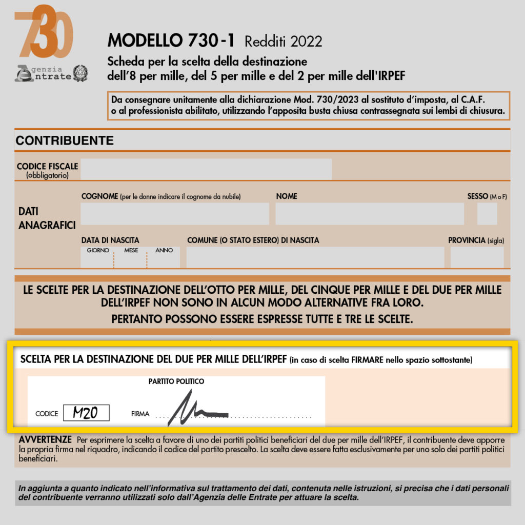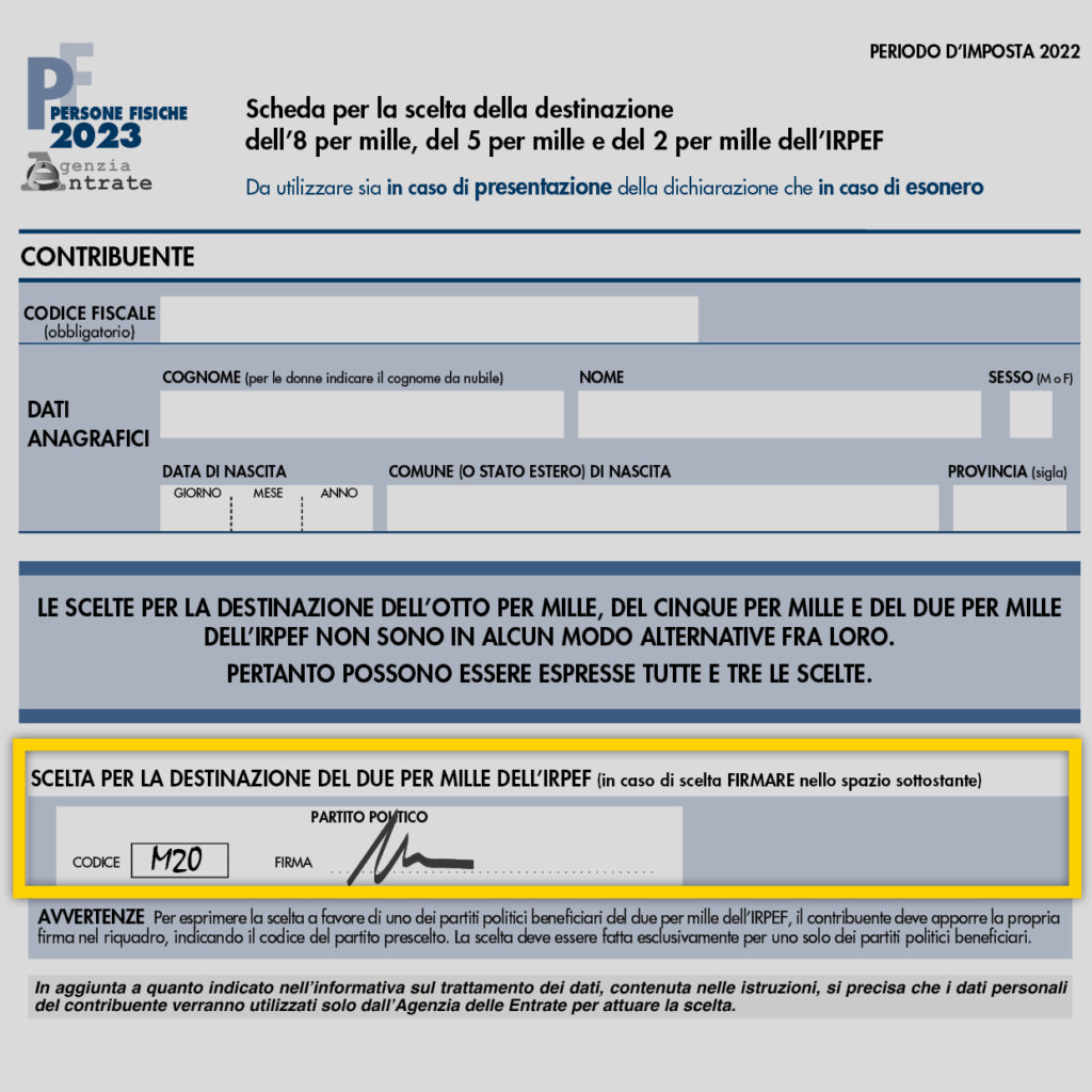 È sufficiente inserire il codice M20 (identificativo del PD) nell’apposito spazio del modello di dichiarazione (730, Modello Unico o CU) e confermare l’indicazione firmando accanto.